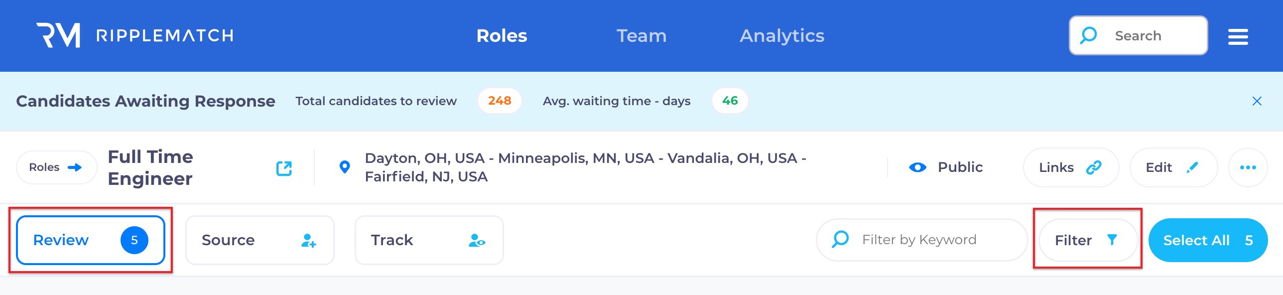 To begin filtering candidates, select the role you’d like to view candidates for, make sure you are in "Review" and click the “Filter” button.