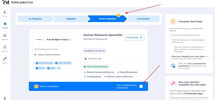 Note: Not all companies require additional steps. If your action needed tab is empty you’re all set to go! Please contact support if you're unable to access your next steps or cannot mark them complete at help@ripplematch.com.