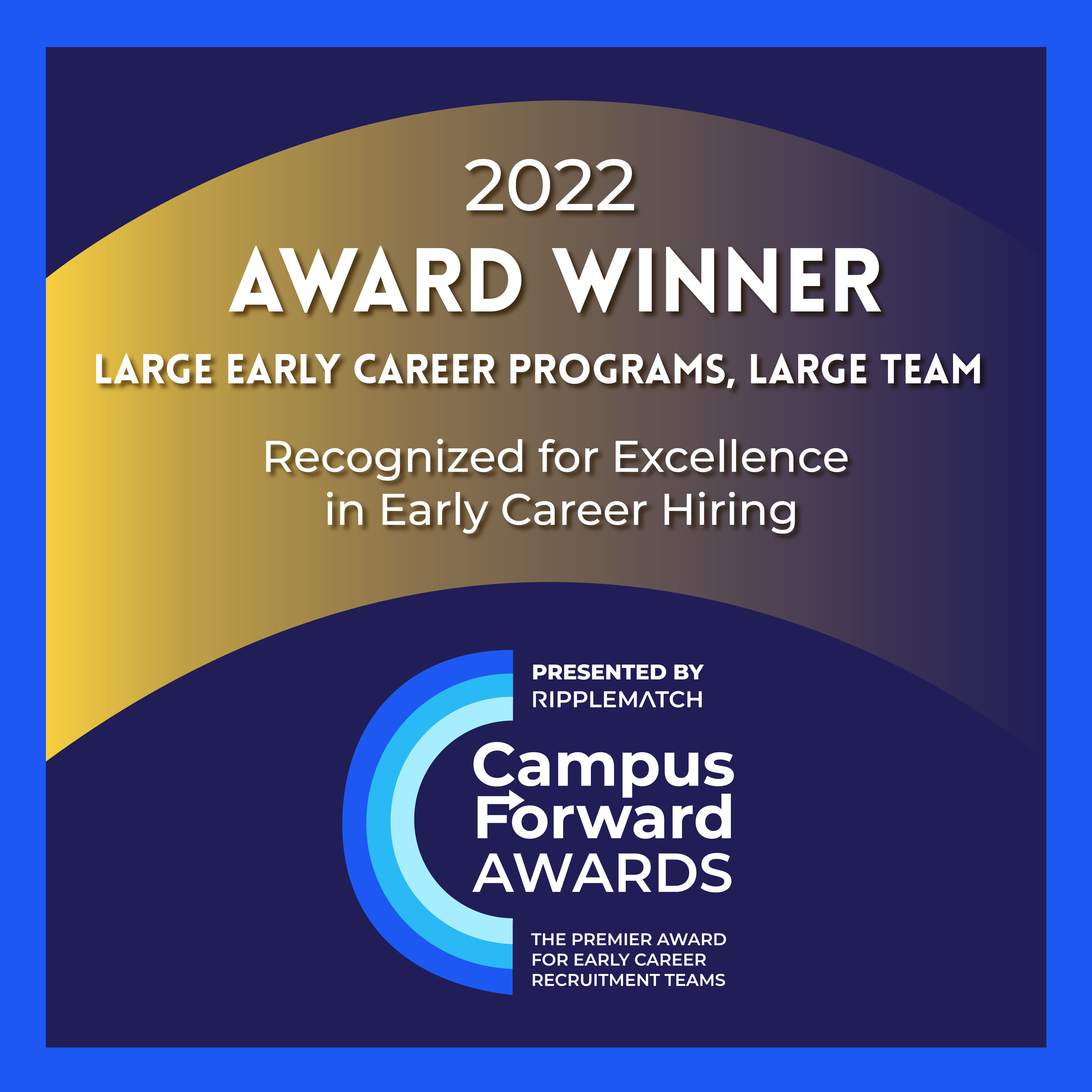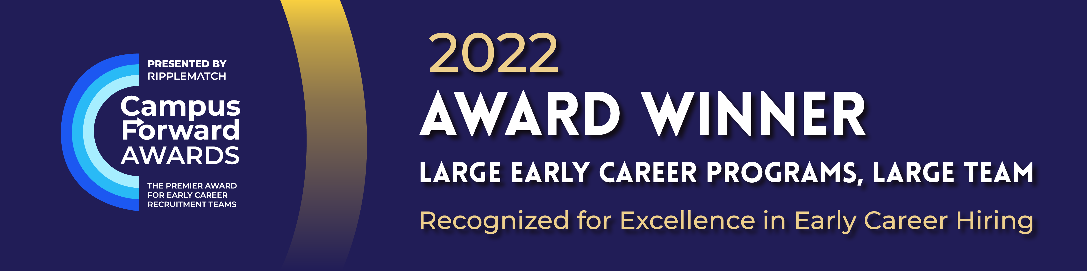 We are excited to share that the early careers recruitment team at [Company name] has been named as a 2022 Campus Forward Award Winner. This Award recognizes excellence in early career hiring, celebrating the teams that embrace innovative recruiting strategies, care deeply about the candidate experience, are making significant investments in D&I, and are supporting the next generation of talent through impactful internships and entry-level programs.