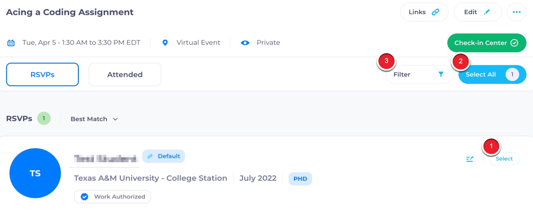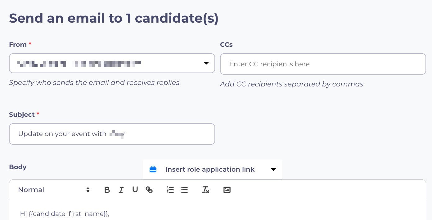 In addition to having the ability to invite new candidates to your events through Source, you can communicate with candidates who have RSVP’d to your events. You can email them about the event itself, follow up with recaps or additional information, and invite them to apply to your open positions before and after the event date.