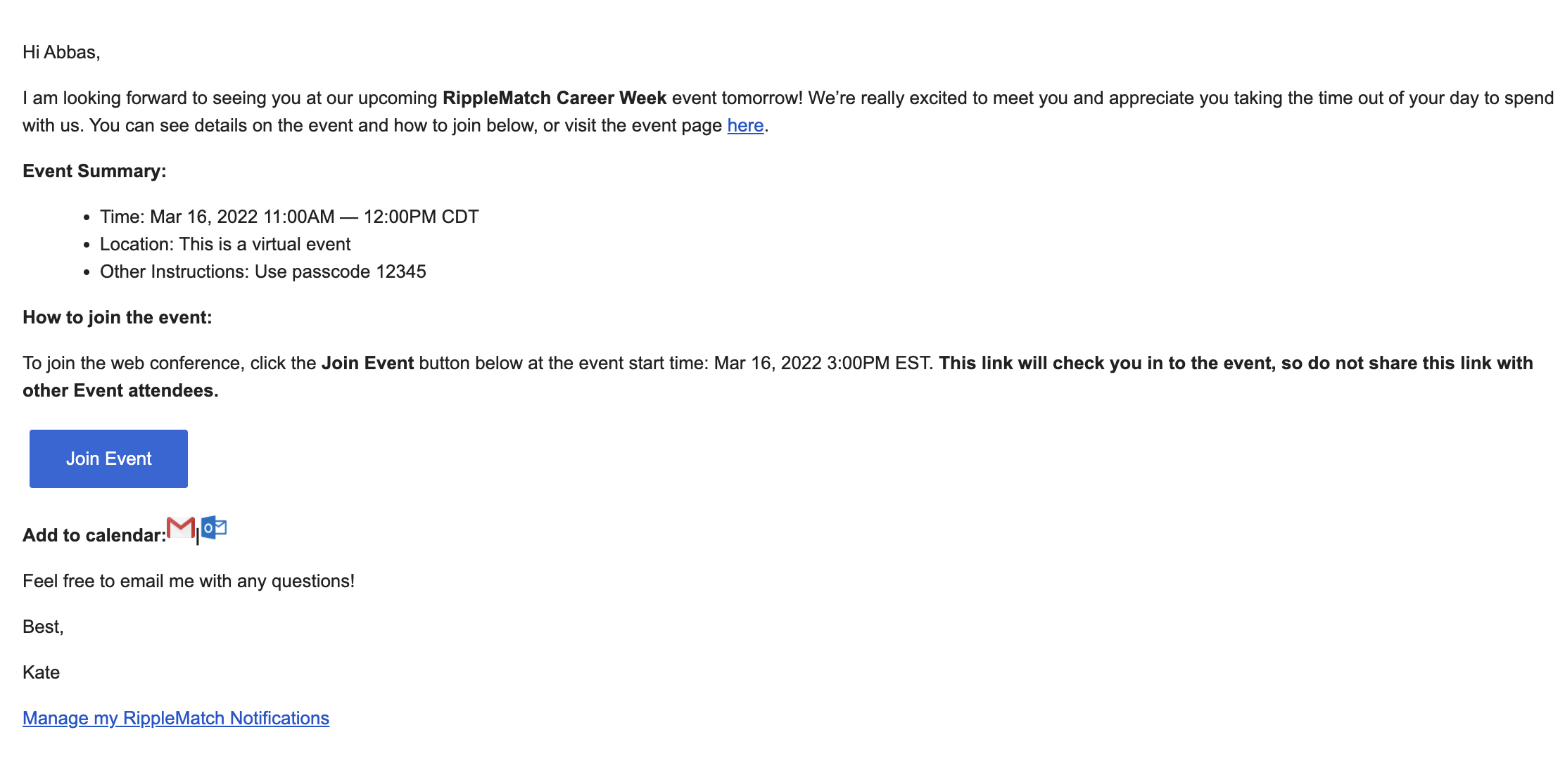 Note: students cannot reply to the recruiter via these emails- they will be directed to RippleMatch. The attendance rate is significantly higher when the sender of the email is a recruiter than RippleMatch.