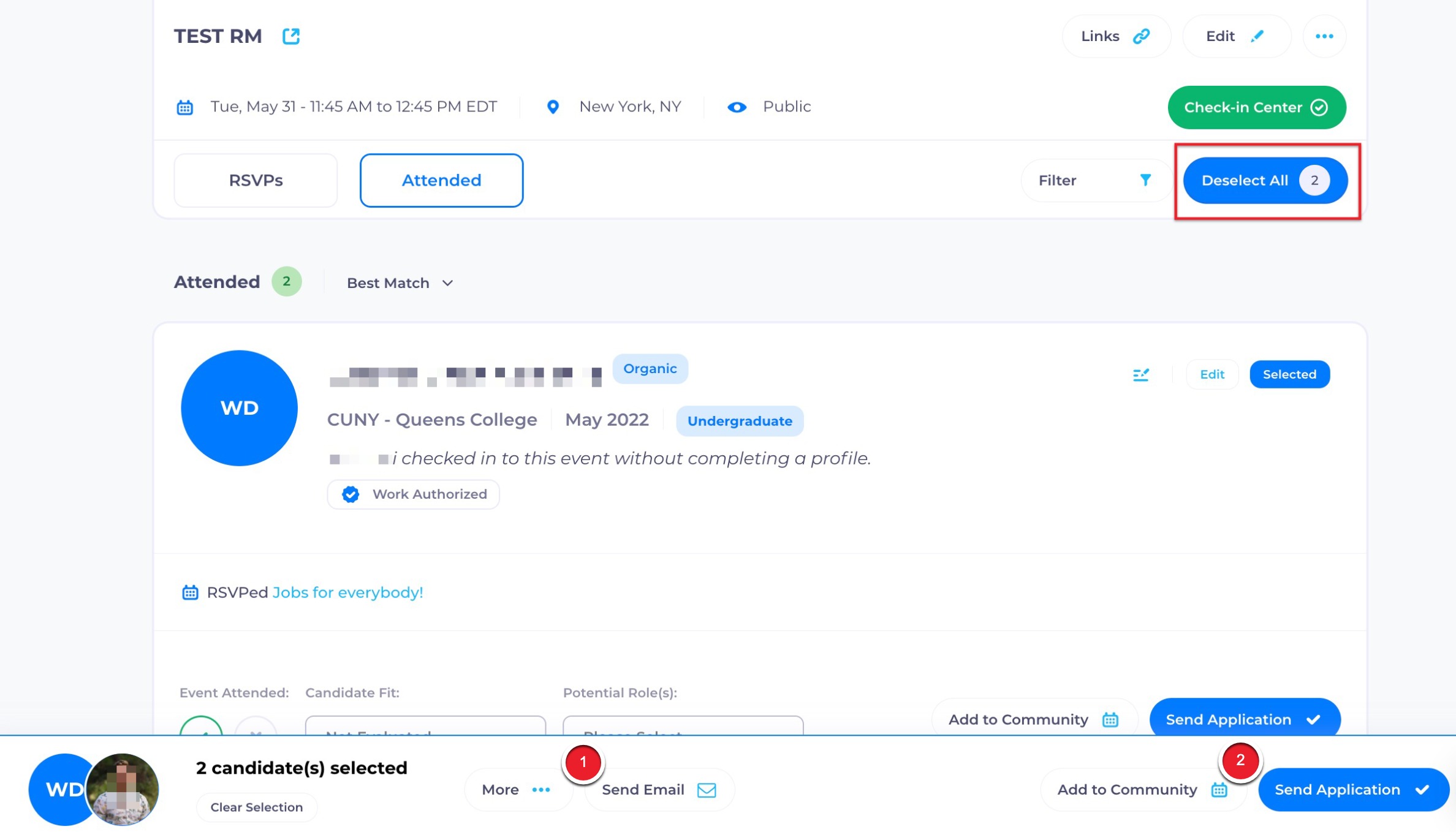 After your event, you have multiple options for following up with a candidate. You have access to the full set of filters to segment out certain attendees for targeted communication/next steps. Once you have set your filters, you can "Select All" and either bulk send an application or email.