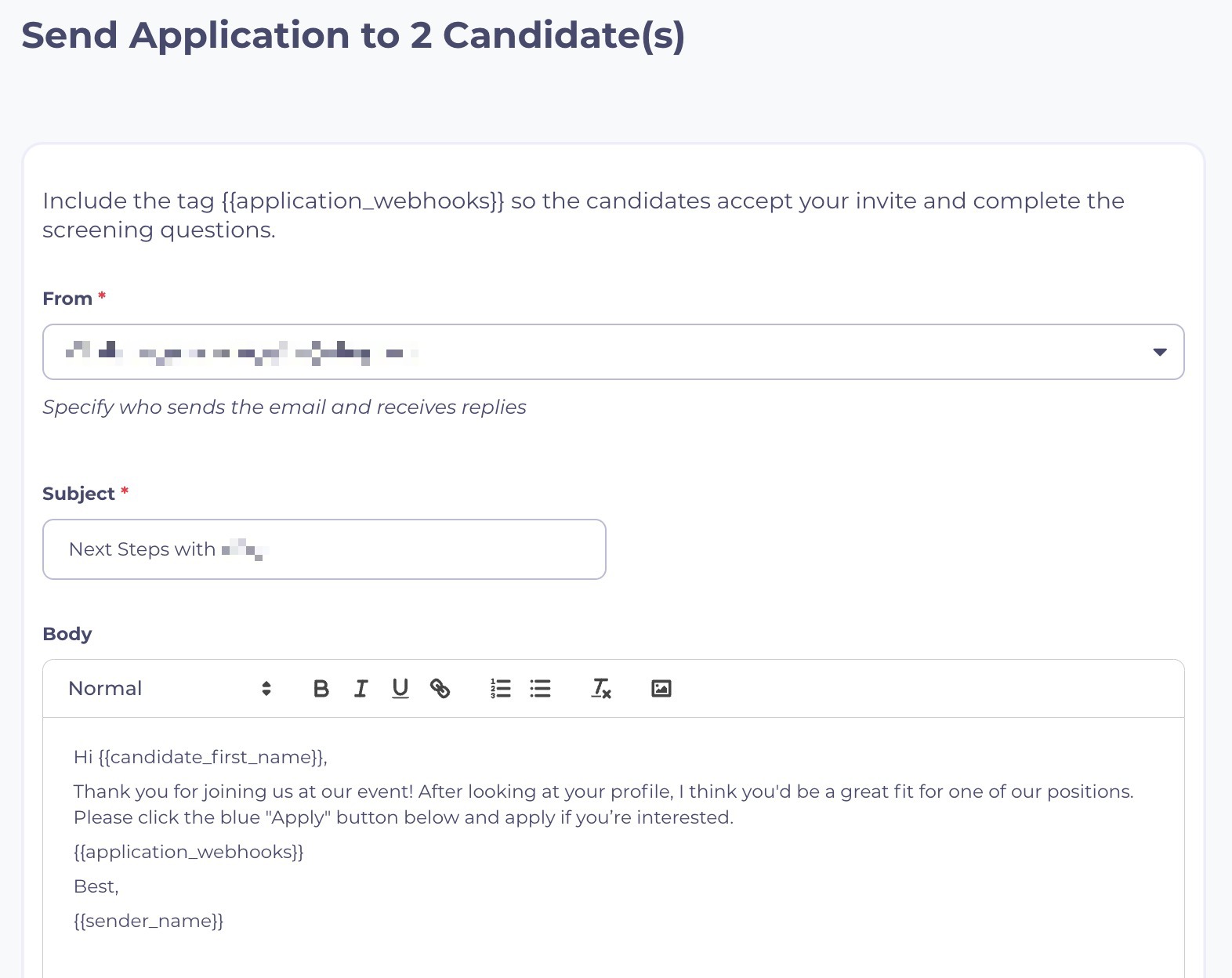 Select all candidates, and then select "Send Email". From here you can customize the email that will be sent to attendees. Choose the sender of the email, the subject line and add anything you'd like to the body of the email. If there is already text in the body of the email, you can delete it and add your own communications. We recommend leaving in the web hooks that will pull through the sender and candidate's names so it feels more personalized.