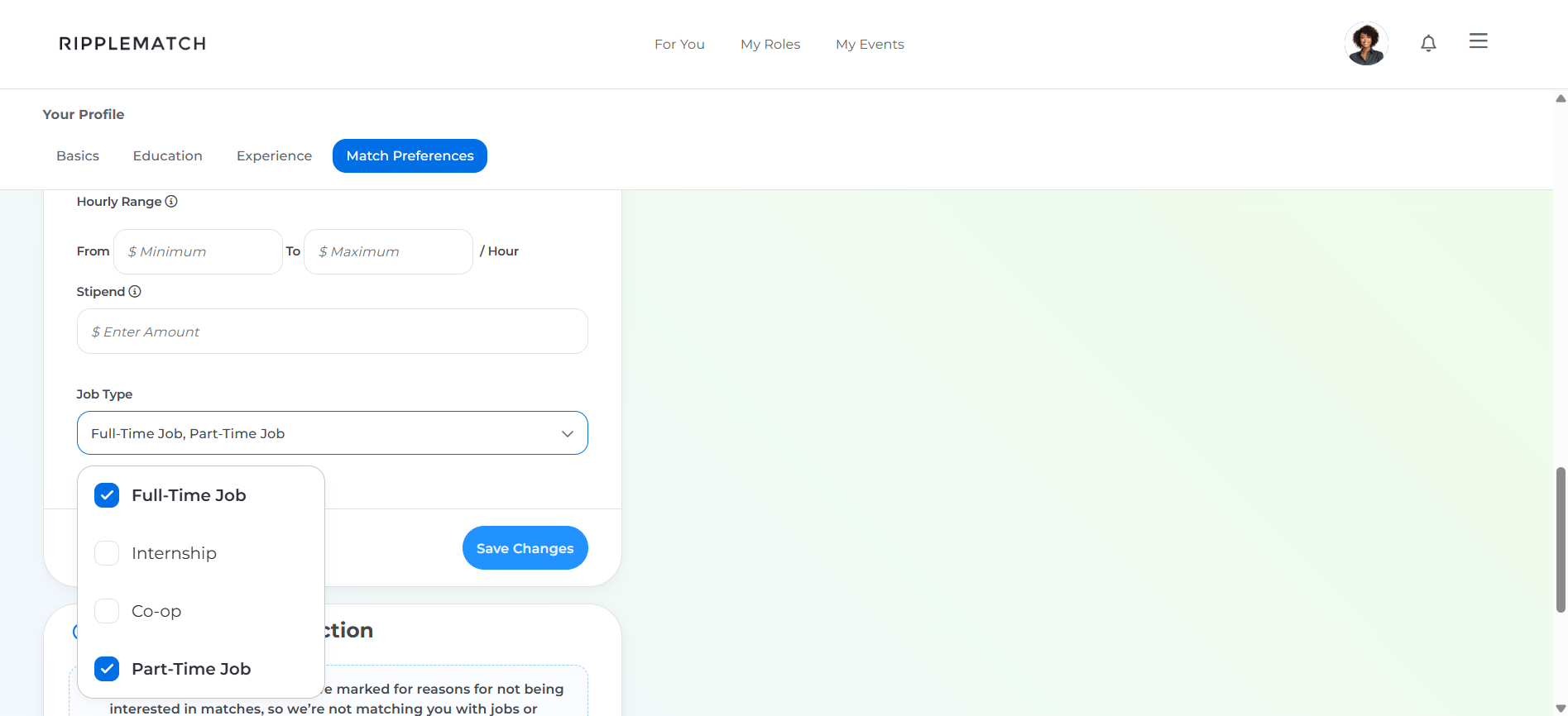 - Once in your profile, click the Match Preference tab and scroll to the bottom of the page until you find the 'opportunities you're looking for' info card