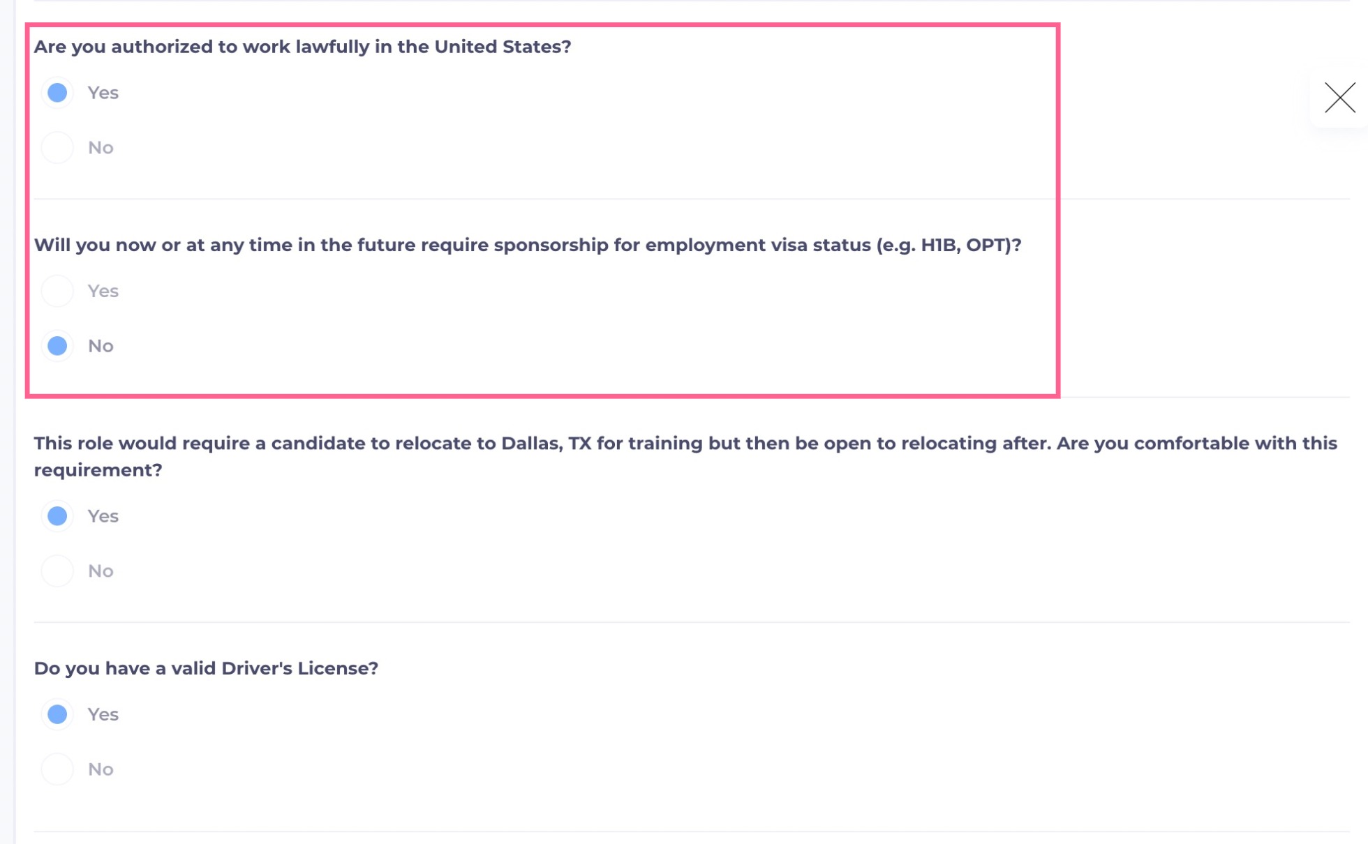 RippleMatch asks if candidates are authorized to work in the US and if they’ll require sponsorship now or in the future at two separate touchpoints. We ask them for this information during the sign-up process and when candidates opt in to a specific opportunity. Candidates with work authorization will have the "Work Authorized" tag on their candidate card, below their university.