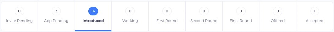 Candidates who you reached out to will initially be sent to the Invite Pending section of the Pipeline. Those who responded to the request by applying to your role and were introduced to you via email will then move to the Introduced section of the Pipeline. If you have an external application that candidates are prompted to complete, they will be moved to the App Pending section of the Pipeline.