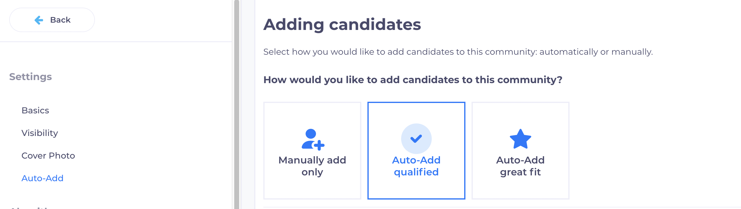 Algorithms are available for Auto-Add Communities. Auto-Add Qualified will add candidates with a 70% fit score or higher and Auto-Add Great Fit will add candidates with an 85% fit score.