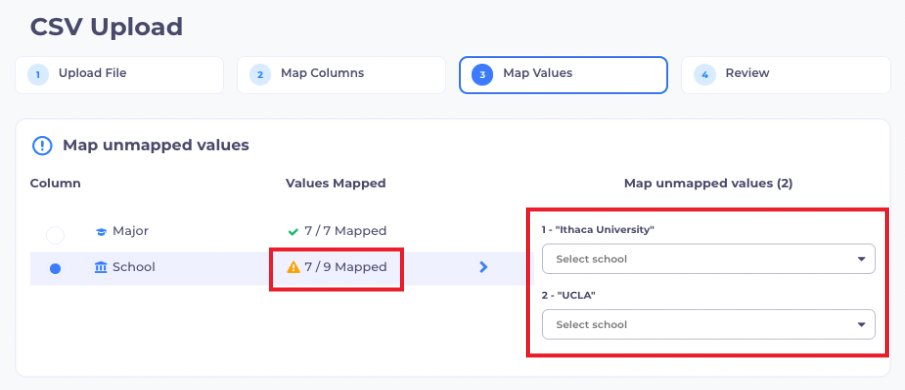 Once fully loaded, if you see any caution signs, map the majors and schools to accepted fields if any are missing. Find the closest major if the exact one is not on the list. If there are any other issues, school or major can be left blank.