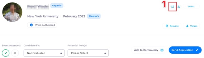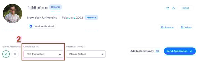 Candidate Fit: You can also assess a candidate’s fit by selecting the best option from the dropdown menu. Options include: Great fit, Good fit, Future fit, Not a fit. Then, you can filter candidates using these ratings when following up post-event.