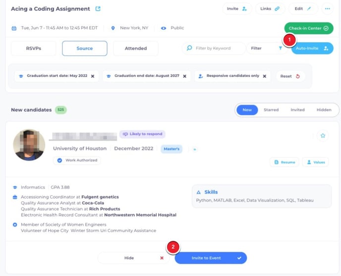 Select “Auto-Invite” to choose the number of candidates that you would like to email. All candidates will automatically receive an email inviting them to your event.