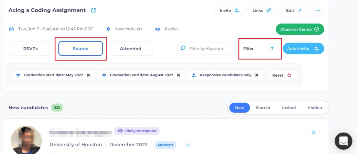 After creating the event, you will notice the "Source" button right next to the "RSVPs" button. Once you click that, you will be able to add different filters as a way to segment good-fit candidates whom you will want to invite to your event in bulk via email.