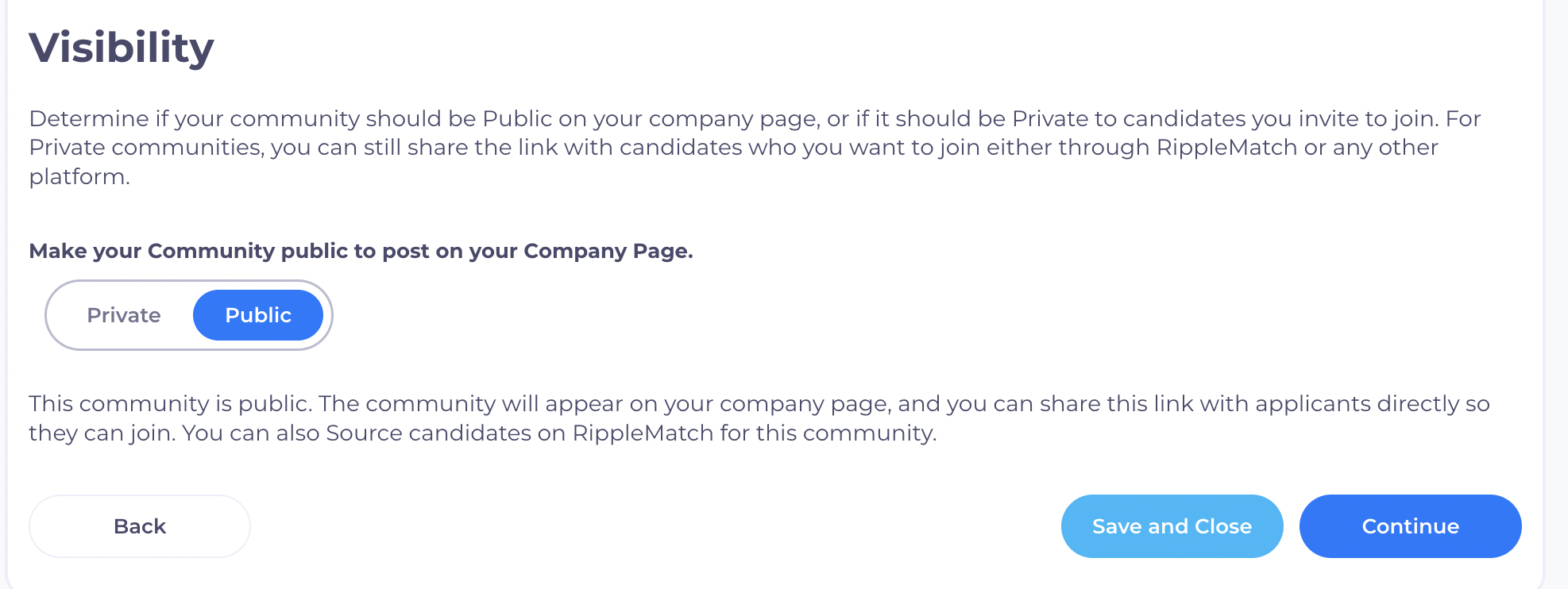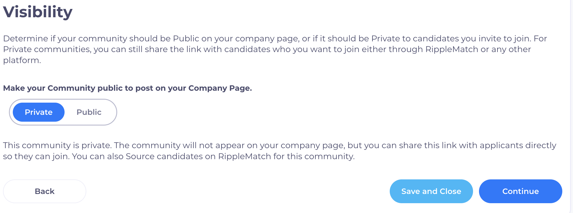 Note - you can invite candidates to join a private community themselves if you share a tracking link with them! Private communities will not be published on the company-branded page or otherwise available for candidates to view.