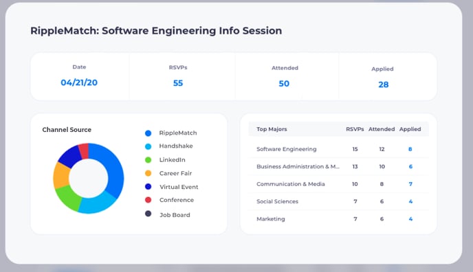 Event-specific data on RSVPs, attendance, number of candidates who have applied, and top majors
