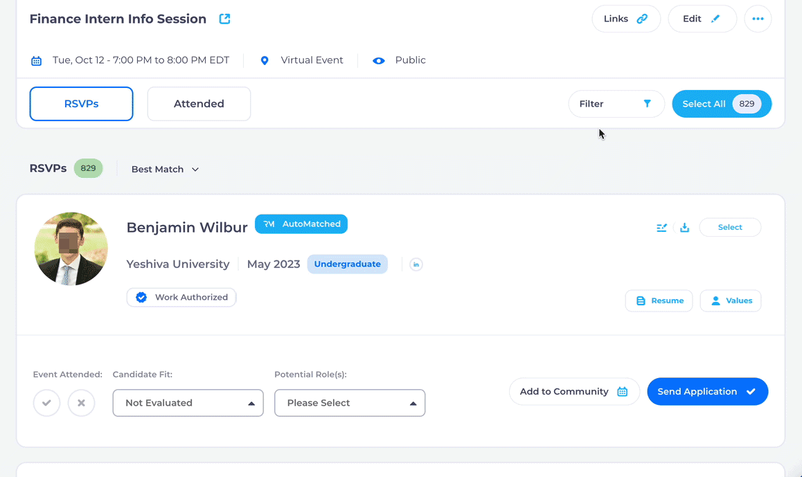 You can filter candidates who have RSVP’d to or attended your event by going into either the RSVP or Attendee tabs and going to the 'Filters' section. From here you can segment candidates by anything that RippleMatch tracks on them.