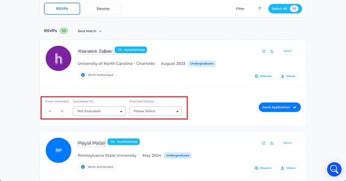After the event, you’ll also be able to see whether or not the candidate attended, which will be automatically tracked if a candidate checks in through a link/QR code provided by RippleMatch or can be tracked manually by your team. You can also assign whether or not a candidate is a good fit for your company with the Candidate Fit drop-down options.