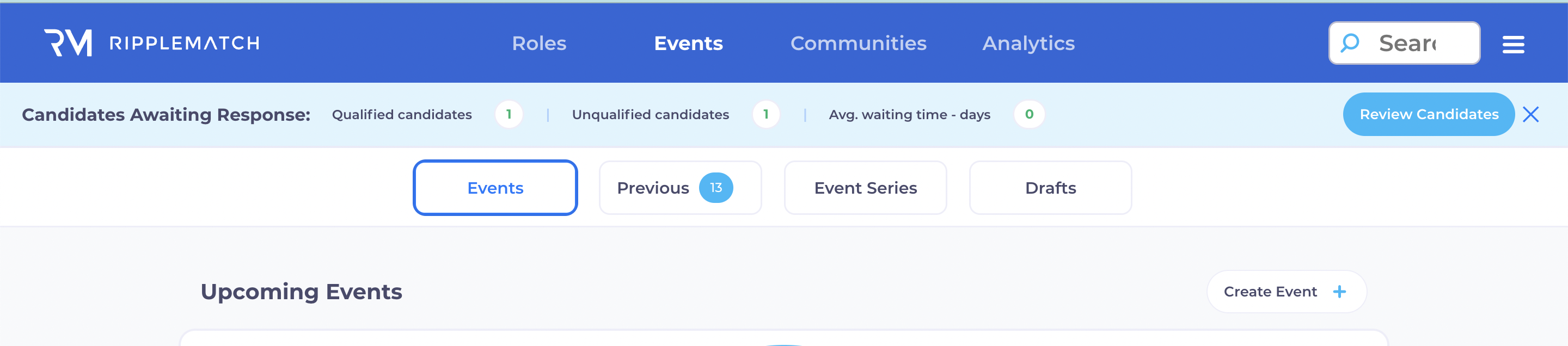 To view the Events Creation & Management Portal, login into RippleMatch and click the “Events” tab in the blue navigation bar at the top of the page.