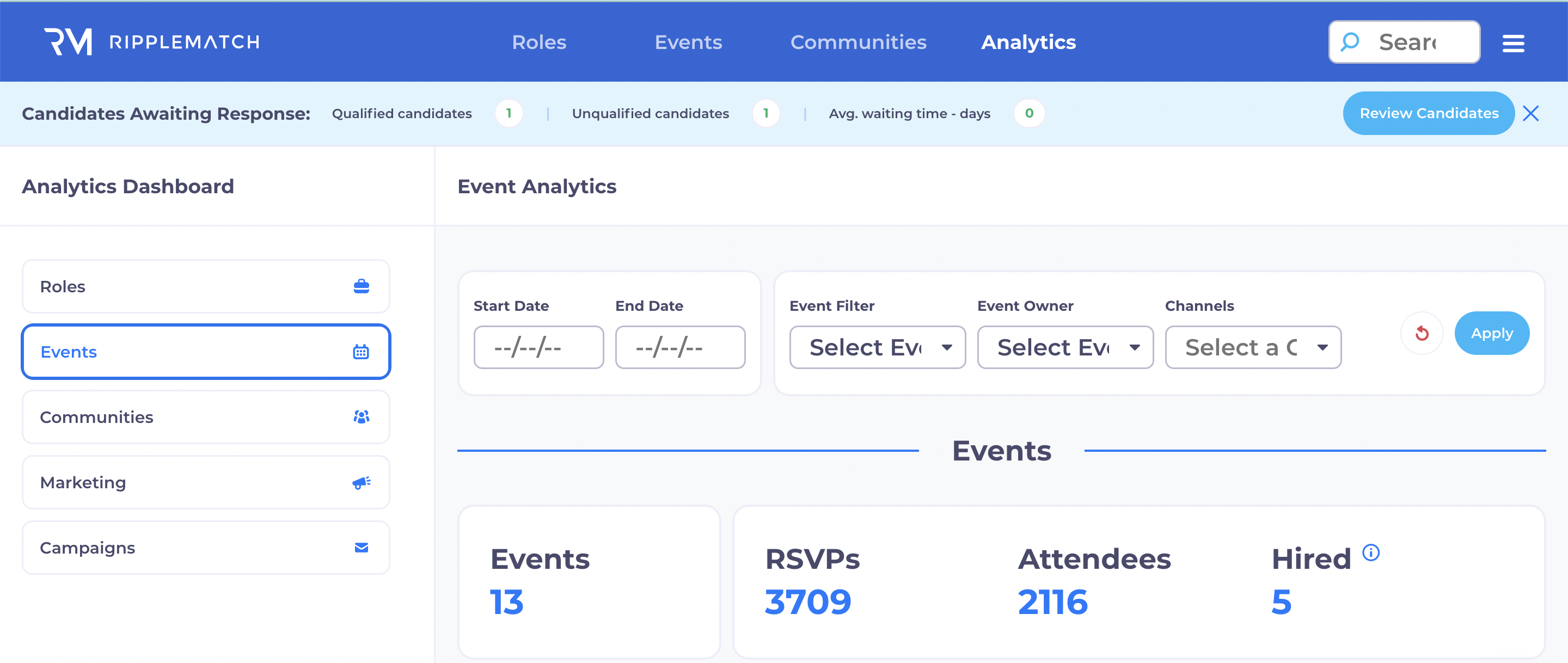 Each event you participate in (like career fairs) or host should be created within RippleMatch Events so you can have a centralized record of the candidates you meet across all of your recruitment efforts.