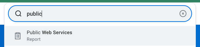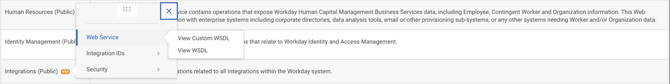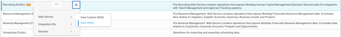Using the search bar, locate the Public Web Services report again and click into it. From here, locate the Integrations (Public) web service listed and then click the ellipsis icon near the words Integrations (Public) to reveal a drop-down menu.