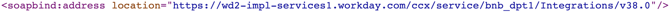 The Recruiting WSDL URL is the part of this line that reads https://wd2-impl-services1.workday.com/ccx/service/bnb_dpt1/Recruiting/v37.0. If you're unfamiliar with the WDSL, you can use Command + F to search the doc for "soapbind:address" which should locate the Recruiting WSDL URL for you. Save this Recruiting WSDL URL for a future step.