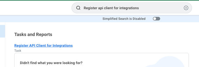 Log in to the Workday tenant. In the Search field, type Register api client for integrations.