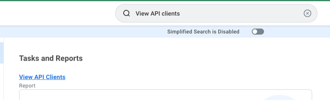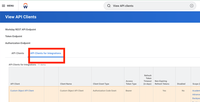 Log in to Workday. In the Search field, type View API clients and select the View API Clients task.