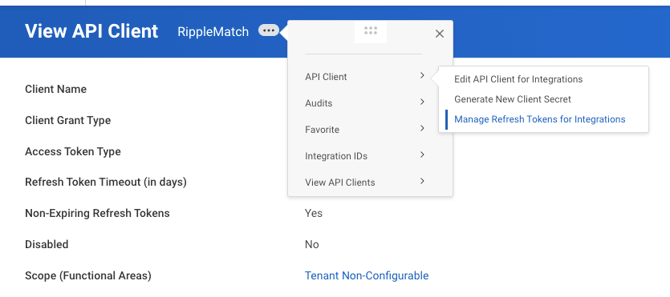 Click the three dots next to the client name in the top left, and then click API Client > Manage Refresh Tokens for Integrations.