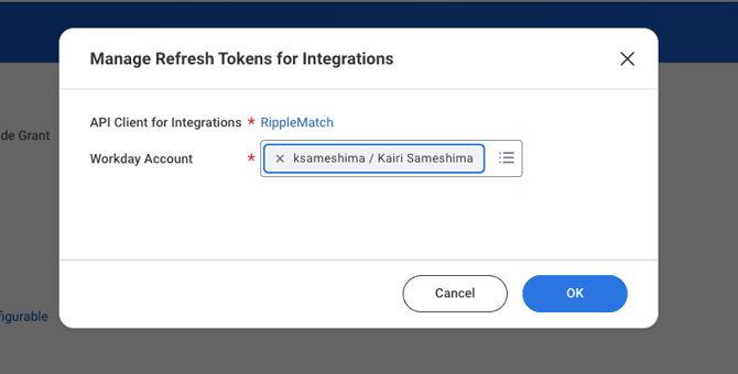 On the Manage Refresh Tokens for Integrations page, in the Workday Account field, enter the Workday account of a user with access to the custom report.